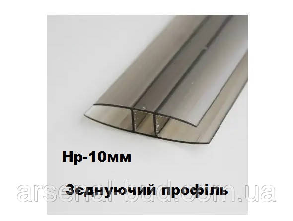 НР-з’єднувальні профіль бронзовий та10 мм. З’єднувальний Н-подібний (нероз’ємному) профіль призначений для з’єднання панелей стільникового полікарбонату з одночасним кріпленням їх до конструкції каркасу. Нероз’ємні сполучні профілі найчастіше застосовуються для монтажу стільникового полікарбонату в невеликих конструкціях – там, де протяжність стику невелика. Особливо популярні вони в будівництві сезонних теплиць. Вигин профілів – відповідно до мінімальних радіусами вигину стільникового полікарбонату відповідної товщини.